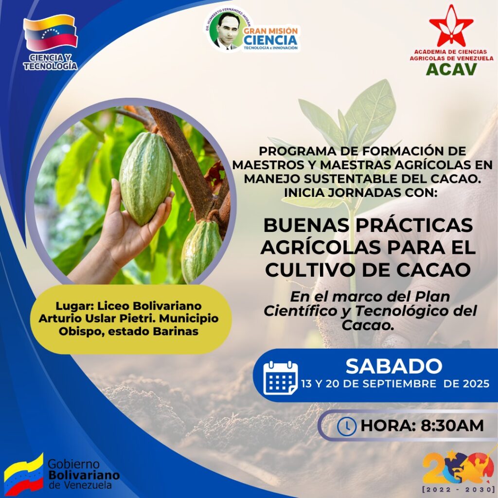 (Caracas, 5 de septiembre de 2025). – La Academia de Ciencias Agrícolas de Venezuela (ACAV), adscrita al Ministerio del Poder Popular para Ciencia y Tecnología (Mincyt), a través del Programa de Formación de Maestros y Maestras Agrícolas en Manejo Sustentable del Cacao, promueve jornadas formativas sobre las buenas prácticas para el cultivo del rubro.