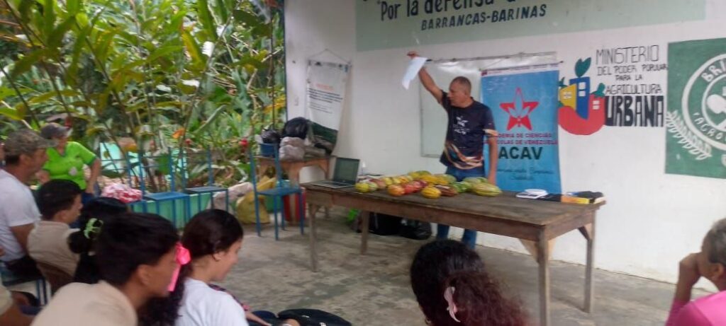 La actividad se realizó en el Grupo Ecológico La Ciénaga II, en el municipio Cruz Paredes del estado Barinas, con la participación de 33 productoras y productores, quienes fortalecieron sus conocimientos científicos orientados a optimizar la producción cacaotera desde un enfoque sustentable.