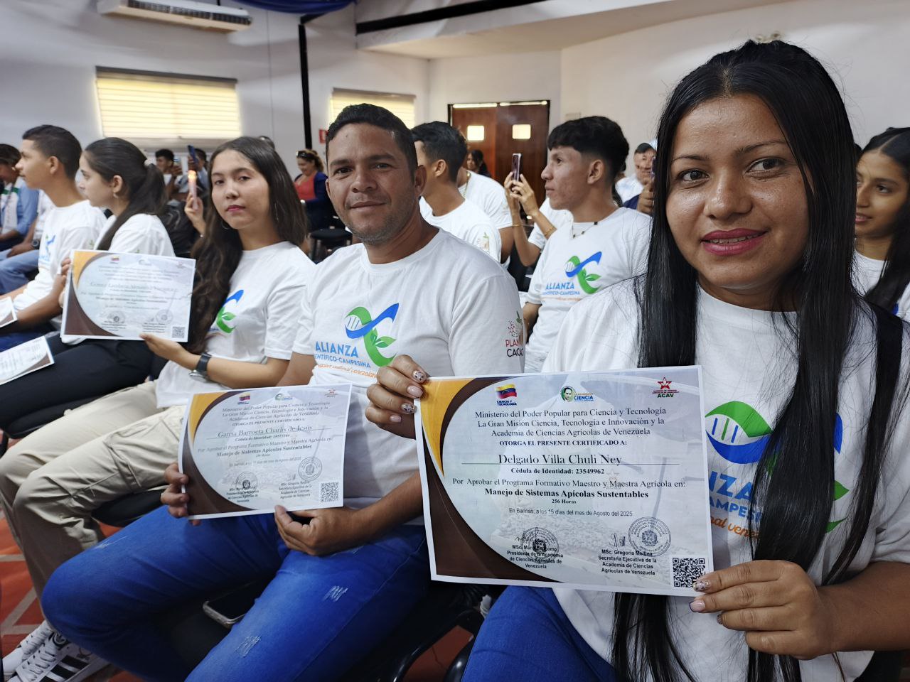 (Caracas, 17 de agosto de 2025).- La Academia de Ciencias Agrícolas de Venezuela (ACAV) celebró en el auditorio de su sede principal, ubicada en el estado Barinas, la entrega de certificados a los participantes que culminaron con éxito el Programa Formativo Maestros y Maestras Agrícolas en Manejo de Sistemas Apícolas Sustentables y el Diplomado en Investigación Científica Aplicada a las Ciencias Agrícolas. En total, 46 participantes recibieron sus certificados: 24 del programa de formación en apicultura sustentable y 22 del diplomado en investigación científica aplicada. Durante la ceremonia se entregaron también certificados de reconocimiento a los facilitadores, en agradecimiento a su compromiso y vocación de formar. La capacitación académica dictada por la ACAV fortalece la preparación técnica y científica de jóvenes estudiantes, investigadores y profesionales vinculados al área agrícola, quienes apuestan por el conocimiento como herramienta para transformar la realidad productiva del país. La jornada incluyó intervenciones de autoridades de la ACAV y del Ministerio del Poder Popular para las Comunas y Movimientos Sociales, a través de la Fundación de Capacitación e Innovación para Apoyar la Revolución Agraria (Ciara), quienes resaltaron la importancia de la formación como motor de transformación para el desarrollo agrícola nacional. Esta certificación responde a las políticas del presidente de la República Nicolás Maduro, ejercidas a través del Ministerio del Poder Popular para Ciencia y Tecnología y de la Gran Misión Ciencia, Tecnología e Innovación Dr. Humberto Fernández-Morán, en atención a la 6ta Transformación: Ecosocialismo, Ciencia, Tecnología e Innovación.