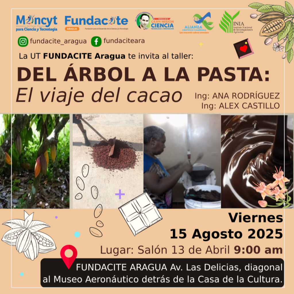 (Caracas, 13 de agosto de 2025).- La Fundación para el Desarrollo de la Ciencia y la Tecnología (Fundacite) en el estado Aragua invita al público general a participar en el taller Del Árbol a la Pasta: El viaje del cacao, una jornada vinculada a la Gran Misión Ciencia, Tecnología e Innovación Dr. Humberto Fernández-Morán.