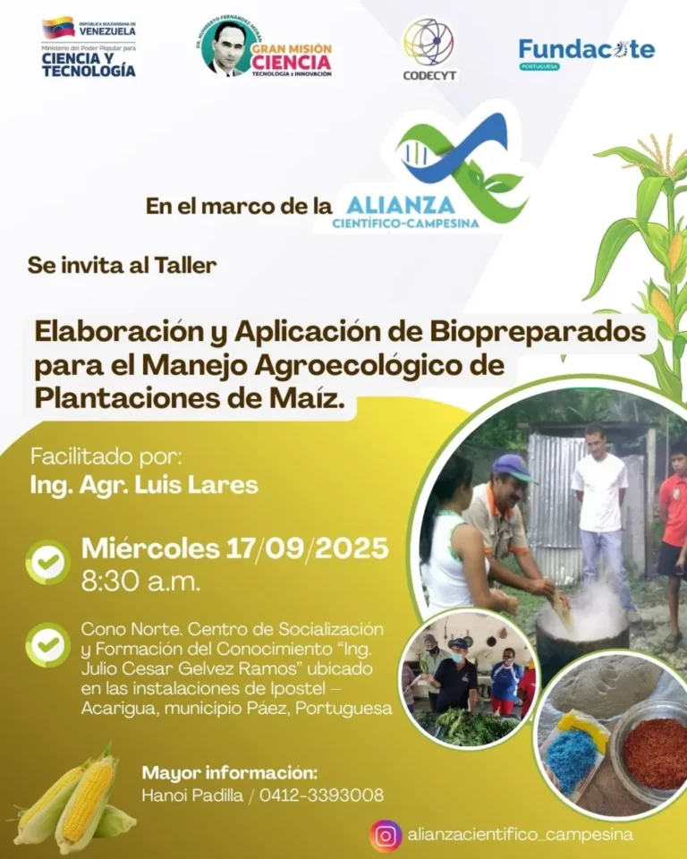 (Caracas, 12 de septiembre de 2025). – Como parte de la Alianza Científico-Campesina promovida por el Ministerio del Poder Popular para Ciencia y Tecnología (Mincyt), se realizará el taller Elaboración y aplicación de biopreparados para el manejo agroecológico de plantaciones de maíz, dirigido a productores, técnicos y público en general.