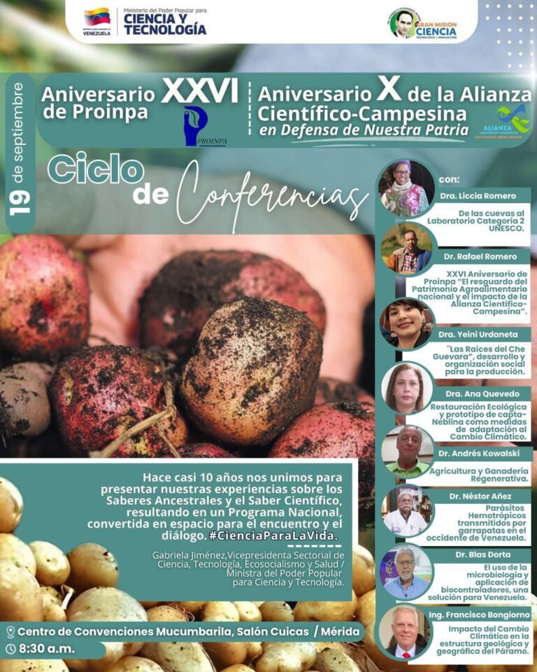 (Caracas, 17 de septiembre de 2025).- La Asociación de Productores Integrales del Páramo (Proinpa) y la Alianza Científico – Campesina celebran semana aniversario con un ciclo de conferencias en el Centro de Convenciones Mucumbarita, del estado Mérida.